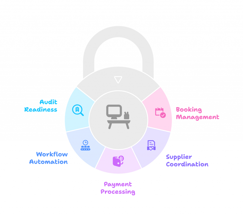 Handle bookings, suppliers, and payments with total control. Automate workflows and stay audit-ready—without the admin burden.
